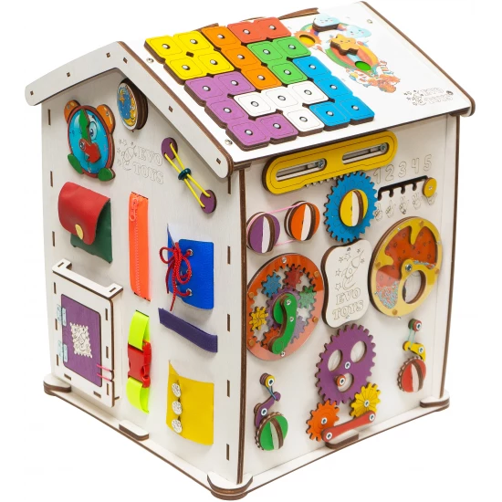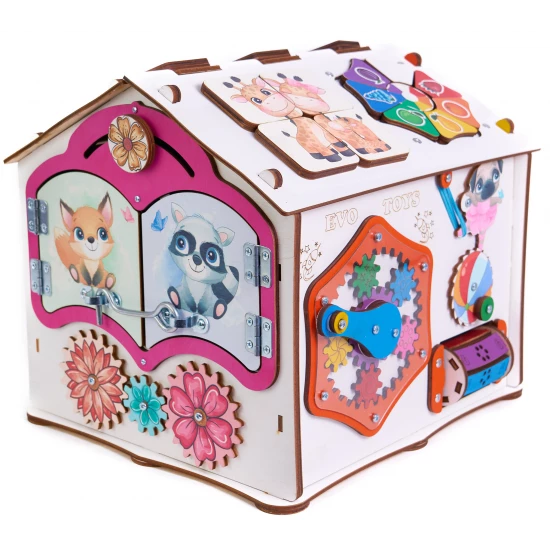 - Благодаря большому количеству деталей домики долго остаются актуальными. Малыши до года исследуют крупные элементы и развивают сенсорику и мелкую моторику. А дети 3-4 лет с удовольствием изучают буквы и цифры, рисуют.