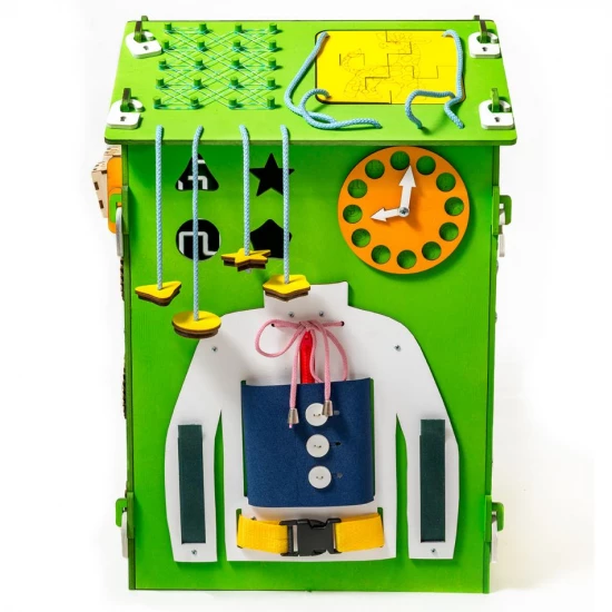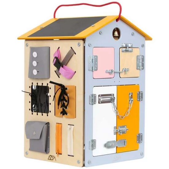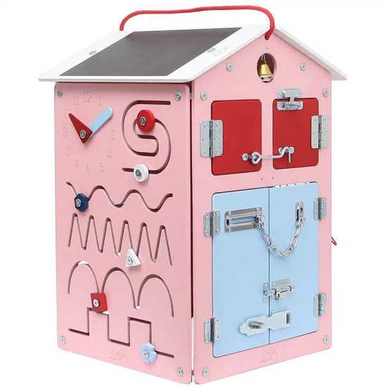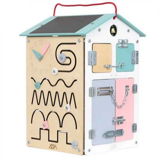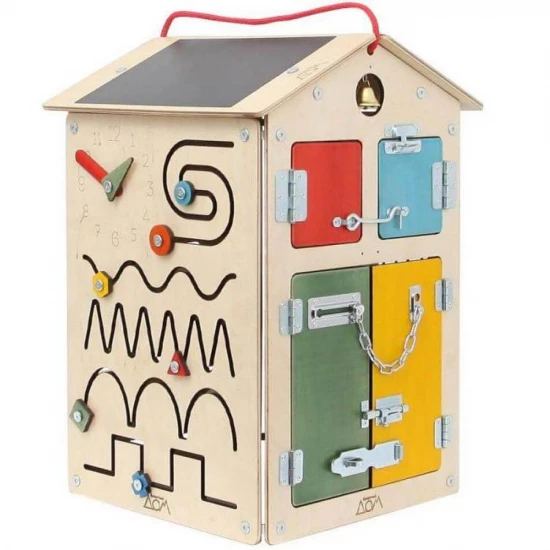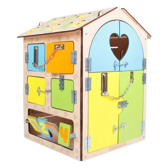 - На его стенах расположено от 50 до 80 и более деталей: дверцы с замками, часы, шестеренки, кармашки с одежной фурнитурой, лабиринты. Благодаря разнообразию элементов, с большим домиком ребенок может играть несколько лет, не теряя интереса.