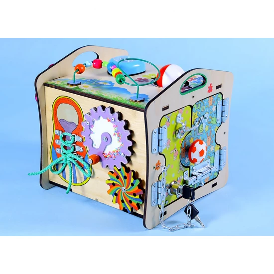 - оснащенные самыми интересными для детей предметами: одежной фурнитурой, шестеренками, дверцами с замками, лабиринтами.